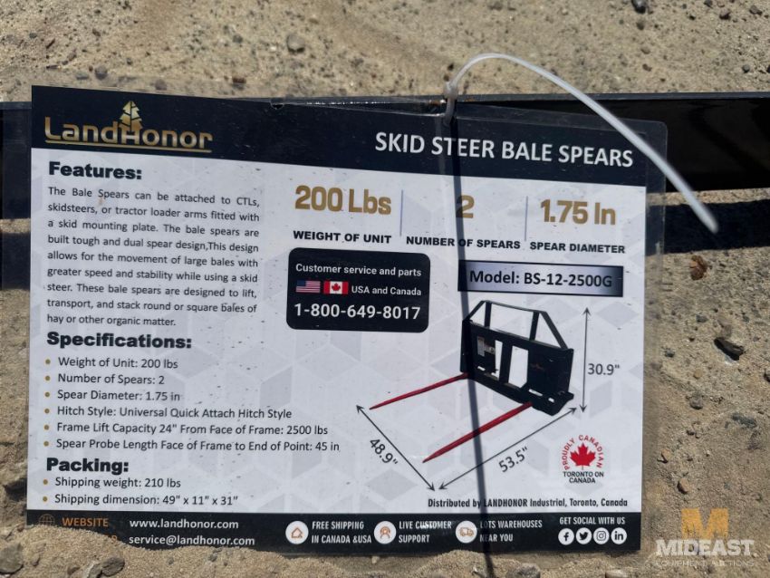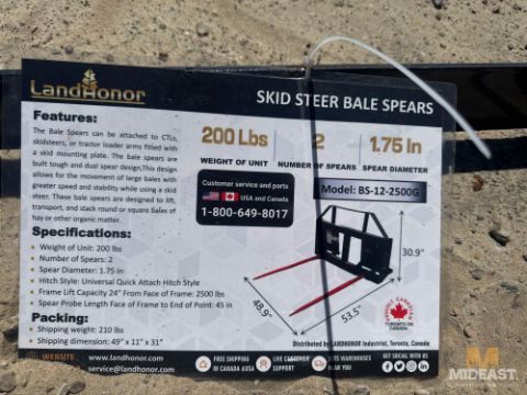 Skid Steer Bale Spears, Skid Steer Bale Spears, Weighs 200lbs, Brand New, 1,750 Max Weight Rating, Steel Frame with Quick Attach Mounting Plate, SN 00120
